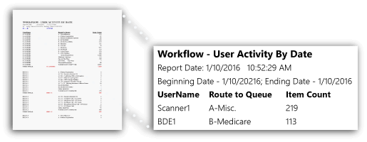 Reports based on scanning provide details on the number of batches and documents scanned per week, per day, per hour. Workflow reports provide various levels of productivity reports — at a high level for the entire department and also an individual user level. Compliance reports are available, created specifically to accommodate privacy laws, like HIPAA and HITECH.